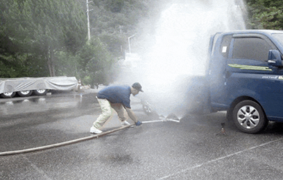 질식소화포 덮개 후, 하부 관창을 통해 화재 차량 하단을 빠르게 냉각·진압할 수 있습니다. 이동식 바퀴 구조로 차량 하부에 손쉽게 접근·작동 가능합니다. 25A와 40A로 나누어 각각 사이즈가 다르며 배터리를 집중 냉각할 수 있도록 4단 노즐로 구성 되었습니다.